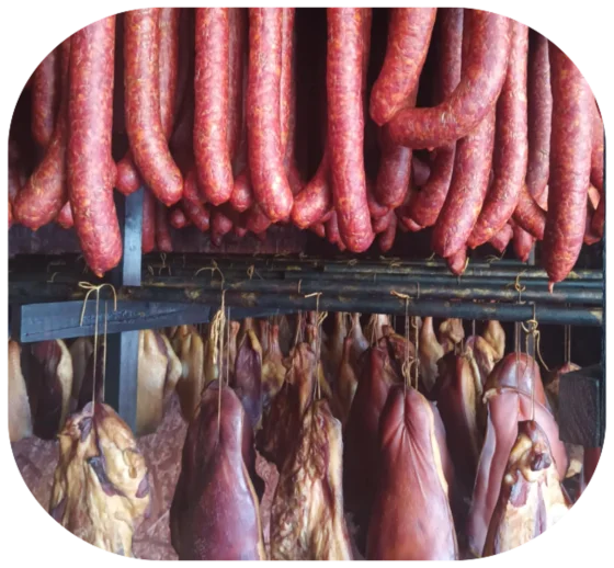 Az általunk helyben gyártott hentesáruk között megtalálhatók füstölt áruk, szalonnák, kolbászok, sült és kövesztett termékek, pácolt húsok.